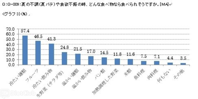 食欲不振時でも食べられるものを聞いたところ、「冷たい麺類」が57.4%と最も多く、次いで「フルーツ」「冷たい飲み物」が、それぞれ約4割で続き、生野菜(サラダ等)が24.8%と、スタミナがつきそうな肉料理やお米より、あっさりした冷たいものが上位を占めた。特に女性は夏バテ時に「フルーツ」を食べる割合が、40代(64.8%)、50代(58.9%)、20代(58.7%)と高く、冷たい麺類を上回った。