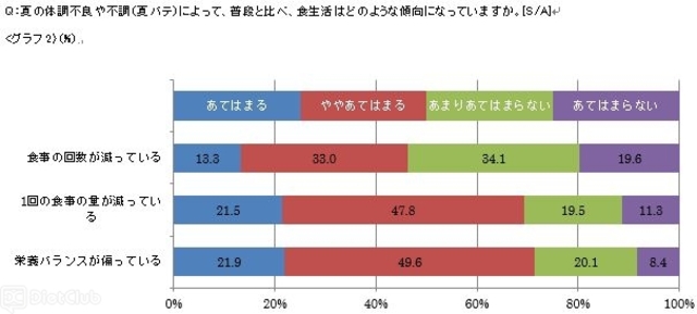 夏の体調不良や不調(夏バテ)による食生活の変化について聞いたところ、半数近くの46.3%が「食事の回数が減っている」と回答。更に「1回の食事量が減っている」と答えた人は69.3%だった。また、夏バテによって、毎日の食事より「栄養バランスが偏っている」と感じている人が71.5%という結果となった。