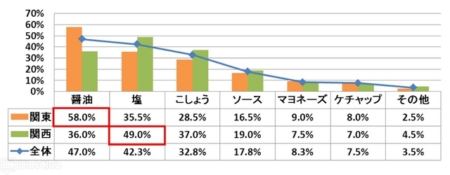 目玉焼きに何をかけて食べるかを聞いたところ、全体では「醤油」が最も多く47.0%で、次いで「塩」が42.3%となっている。地域別で比較をしてみると、関東は「醤油」が最も多く58.0%と、約6割が回答した。関西は「塩」が最も多く49.0%という結果になっている。