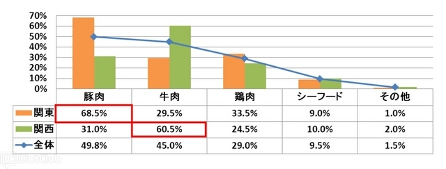 カレーのメイン食材をお聞きしたところ、全体では「豚肉」が最も多く49.8%となった。次いで、「牛肉」が45.0%となっている。地域別で比較をしてみると、関東は「豚肉」と回答した人が68.5%で最も多く、関西では「牛肉」と回答した人が60.5%で最も多かった。
