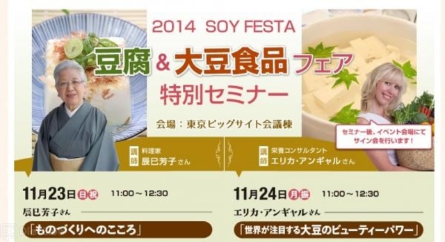 「大豆」に特化したイベントをビッグサイトで開催…11月23日~24日 2014 10/07 food 2014年10月7日 2014豆腐&大豆食品フェア特別セミナー 2014豆腐&大豆食品フェア実行委員会は、11月23日~24日に東京ビッグサイトで、豆腐と大豆食品をPRする『2014豆腐&大豆食品フェア』を開催する。 同イベントは、豆腐をはじめとした、納豆・味噌・醤油・豆乳など日本人に馴染みの深い大豆食品の魅力をPRすべく、業界団体が初めて一堂に会して開催するものとなっている。全国から様々な食材が集まるほか、豆腐を製造する機械の展示や、一般の親子連れでも楽しめる食育イベントなどを予定しているという。 特別セミナーでは、料理家の辰巳芳子氏や、栄養コンサルタントのエリカ・アンギャル氏が登場し、様々な切り口から大豆の魅力を伝える。 food イベント 外食 料理 食育 よかったらシェアしてね! URLをコピーしました! 主婦たちが食品購入時に最も気にしていることは? ソフトブレーン・フィールド調べ ぽっちゃり体型の女性のための“ぷにモテブランドショッピングアプリ”リリース この記事を書いた人 浦和 武蔵 関連記事 ねっとり濃い味なのにダイエットに最適!? 2017年3月14日 山本耕史、妻・堀北真希と「外でも普通に飲みます」 2016年5月23日 種類は100以上! 二子玉川で『カレーパン博覧会2016』が開催…3月6日 2016年3月1日 ブルボン、GABAを配合したクラッカーなどを「機能性表示食品」として発売 2016年2月9日 「レシピブログ」に参加している料理家や料理ブロガー30名による“太鼓判レシピ”を紹介 2016年2月8日 アサヒ飲料、機能性表示食品として「肌の潤いを保つ」清涼飲料水を発売…3月8日から 2016年1月29日 豪華な食べ比べ弁当や人気スイーツが集結する『食の大北海道展』が1月14日から開催 2016年1月13日 1月9日&10日、東京・勝どきで『太陽のマルシェ』が開催 2016年1月6日