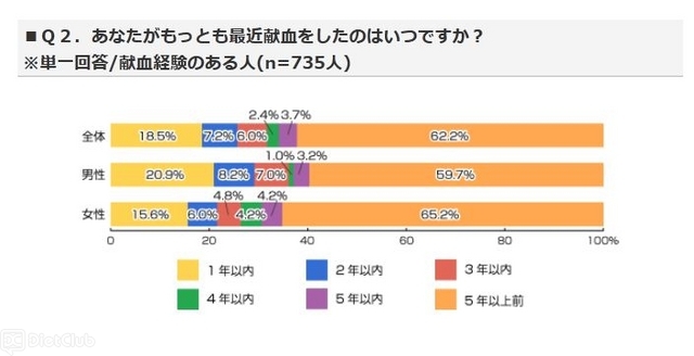 また同調査で、献血経験がある人に『あなたが最近献血をしたのはいつですか?』と聞くと、62.2%の人が「5年以上前」と回答しており、「1年以内」と答えた人は18.5%だった。