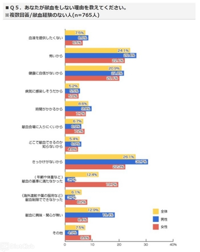そこで、献血をしたことがない人に『献血をしない理由』を尋ねたら、以下のような結果になった。