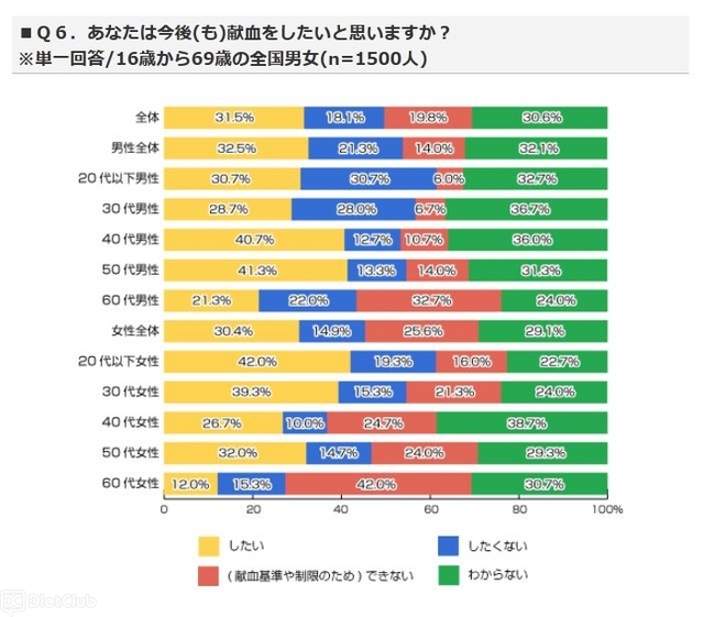 去る10月8日から10日の間に、ライフメディアのリサーチバンクが、16歳~69歳の男女1,500名に「献血に関する調査」を実施したところ、49.0%の人が「献血をしたことがある」と答えたという。