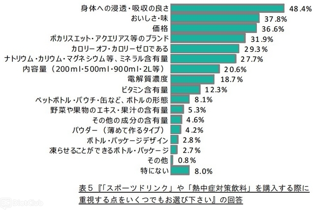スポーツドリンクを選ぶ時、何を重視しているのか聞いたところ、最も多かったのは、「身体への浸透・吸収の良さ」で48.4%だった。 次いで、「おいしさ・味」が37.8%、「価格」が36.6%となっている。ほかにも、「ナトリウム・カリウム・マグネシウム等、ミネラルの含有量」を気にする人が27.7%、「ビタミン含有量」を重視している人が12.3%など、成分も選定基準にしているという傾向が見られた。