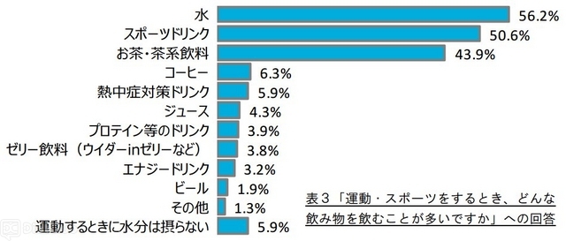 「スポーツをするとき、どんな飲み物を飲みますか?」と聞いたところ、水が56.2%で1位だったが、それに次いで、スポーツドリンクも50.6%と高スコアとなっている。男女別の結果を見ると、男性ではスポーツドリンクが54.5%で、僅差で水に次ぐ2位でしたが、女性では42.7%で、お茶・茶系飲料の51.9%に次ぐ3位にとどまった。また、「スポーツドリンクや熱中症対策飲料をどのぐらいの頻度で飲みますか」と聞いたところ、「ほぼ毎日飲む」と回答した人が11.9%という結果に。特に、アクティブ世代の70代以上の男性にいたっては「毎日飲む」人が25.8%と、4人に1人が毎日スポーツドリンクを飲んでいることがわかった。