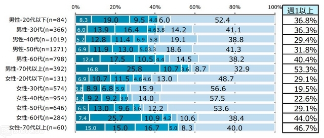 性年代別でスポーツの頻度を見てみると、20代以下の男性と30代から50代の女性は、半数以上が「運動は全くしない」と回答。その一方、60代は男女ともに「週1回以上運動している」人が約40%、70代以上は男女とも「週1回以上運動している」人が約50%と活動的だということがわかった。