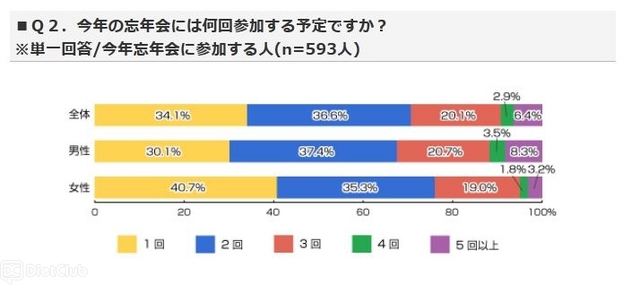 また、同調査で、忘年会に参加すると回答した人に『忘年会には何回参加する予定ですか?』と尋ねると、36.6%の人が「2回」と答えてトップに。次に多かったのは「1回」で34.1%だったが、「5回以上」参加するという人が6.4%いた。