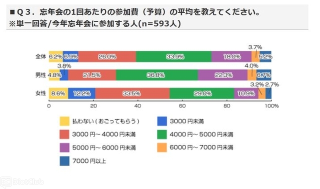 そこで、忘年会に参加する人たちに『忘年会の1回あたりの参加費(予算)の平均』を聞いた結果、以下のような順位になった。
