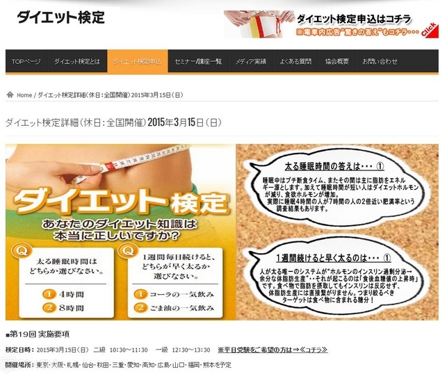 なお、ダイエット検定には、2級(生活アドバイザー/検定料:税別6,000円)と1級(プロフェッショナルアドバイザー/検定料:税別7,000円)があり、年3回、全国で一斉に開催。3月15日に受験したい場合は、2月16日までに、日本ダイエット健康協会のサイトで申込みが必要となる。