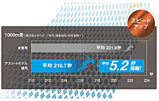 高機能アンダーウェア マッスルパワーSTBのアスリートモデルは、スプリント競技や長時間のランニングに必要な体の動きに応じて、同社独自の「スタビリティラバー」を配置し、スピードやジャンプの動きにこだわったモデル。骨盤とコア(体幹)、骨盤と下半身を連動させ安定性を高めることで、運動時の体のブレを制御し、ムダな動きをなくすことで、ストライドの幅を広げるとともに、脚の振り上げをサポートして、前へと進む力をアップさせる。順天堂大学スポーツ医学(運動器系)研究室の検証結果では、未着用時と比べ1,000m走が平均で5.2秒短縮するというデータが得られており、パフォーマンスの向上が実証されている。