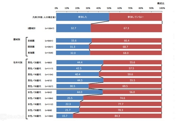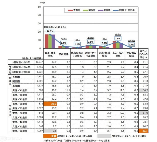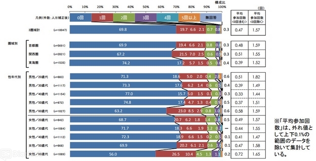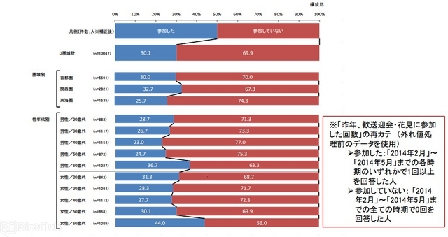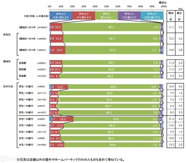 2015年春の歓送迎会・花見への参加回数を聞いたところ、3圏域(首都圏・関西圏・東海圏)合計では、歓送迎会では「増加派」10.8%、「減少派」5.4%、花見では「増加派」11.1%、「減少派」2.5%と、「増加派」が「減少派」を上回り、3年続けての増加予想となった。
