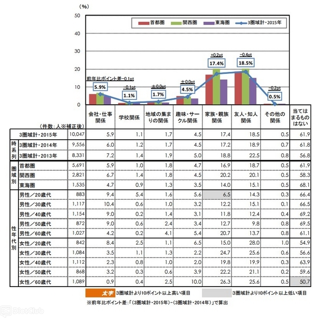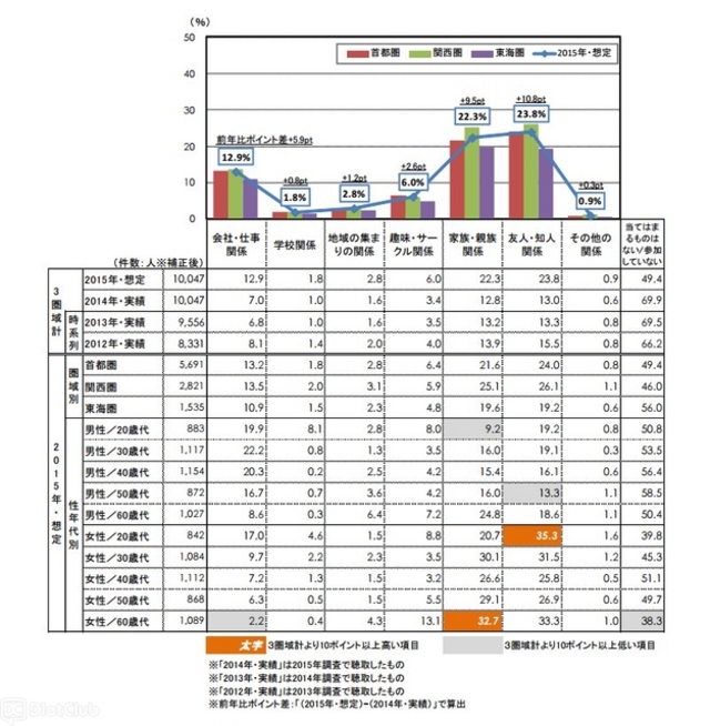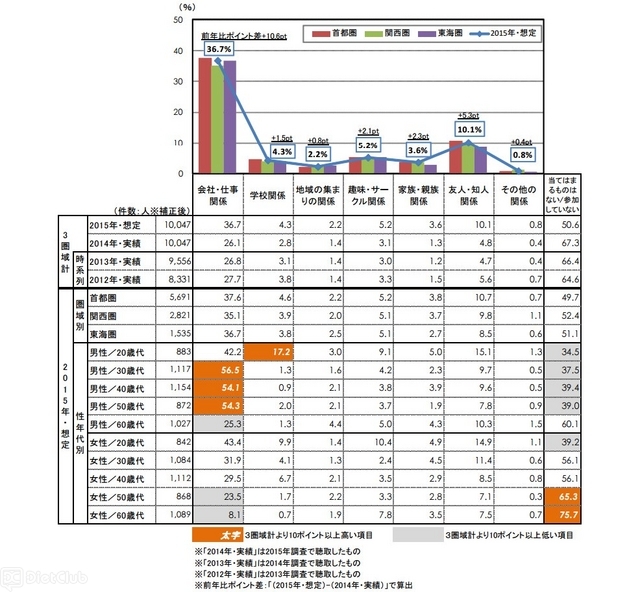 2015年春の歓送迎会・花見を誰と行うかについて聞いたところ、歓送迎会で多そうな相手は「会社・仕事関係(36.7%)」、花見で多そうな機会は「友人・知人関係(23.8%)」が最も多かった。積極参加意向は「家族・親族関係」で歓送迎会・花見ともに微増している。