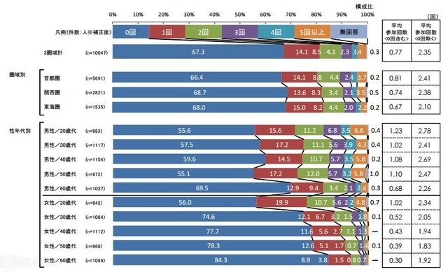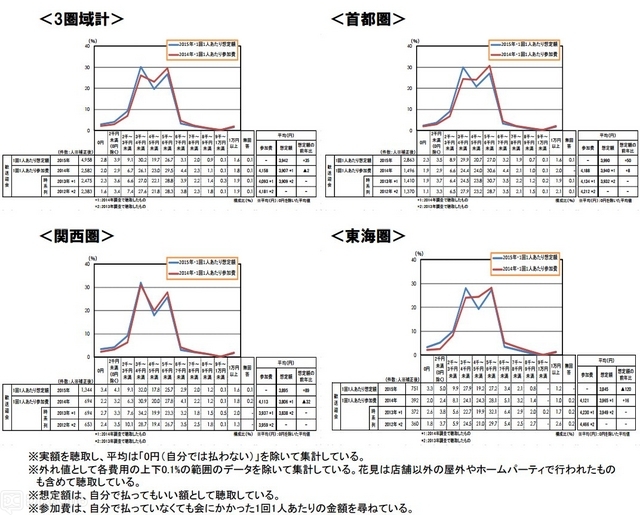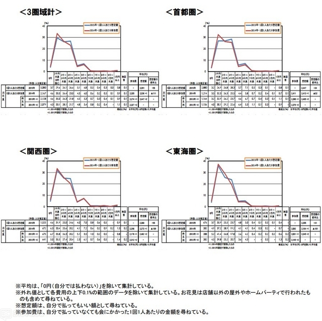 歓送迎会1回1人あたりの想定金額を聞いたところ、3,000円~4,000円未満(30.2%)と5,000~6,000円(26.7%)の、ふたつの山があった。花見は3,000円未満が過半数だった。1回1人あたりの平均支出想定金額は歓送迎会で3,942円(前年比+35円)、花見で2,391円(前年比+55円)と増額傾向の予想となった。