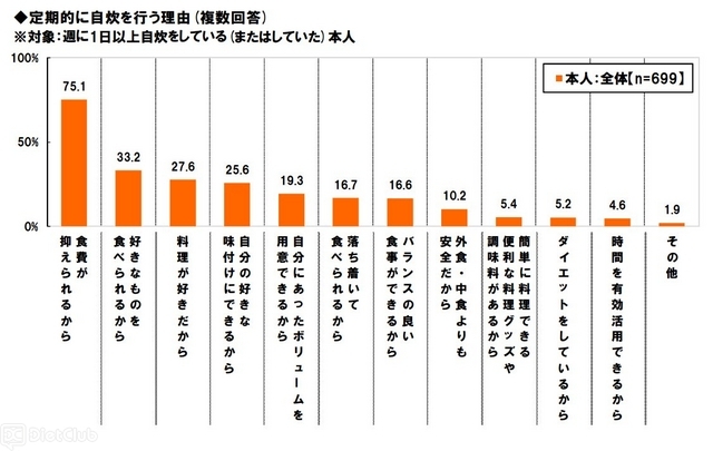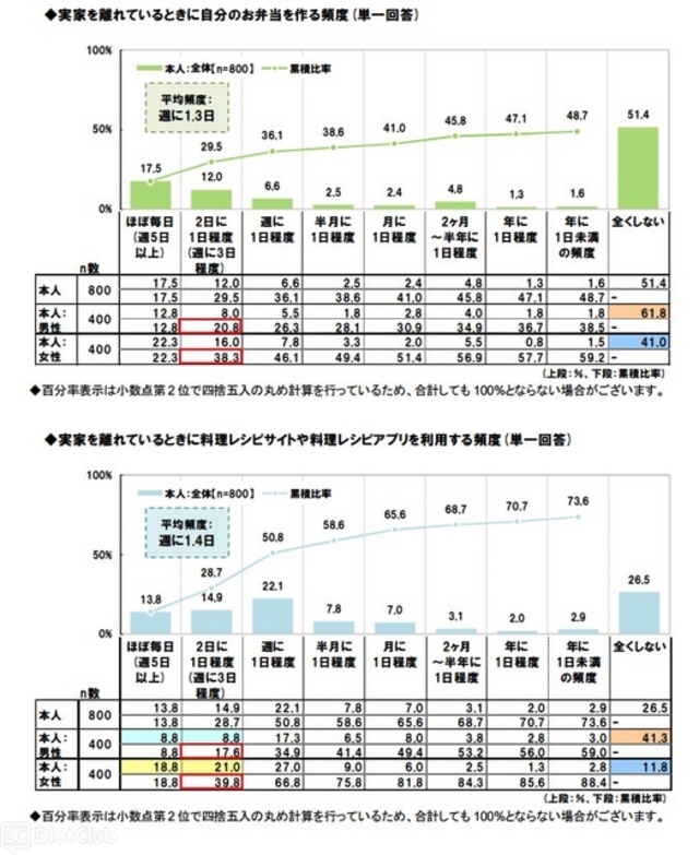 本人に、実家を離れているときに料理を行う頻度について聞いたところ、「ほぼ毎日」が過半数、「2日に1日以上」は4人に3人の割合となった。実家を離れて生活している際に、週に1日以上自炊をしている(またはしていた)本人699人に、定期的に自炊を行う理由を聞いたところ、「食費の節約」と「自分好みの食生活」という回答が多かった。「自分のお弁当を作る」頻度を聞いたところ、2日に1日以上弁当を作る“弁当男子”は5人に1人だった。女性の4割が、2日に1日以上「料理レシピサイトや料理レシピアプリを利用する」ことがわかった。