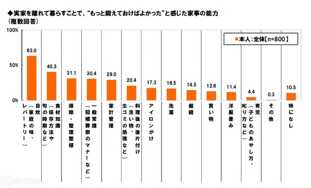 食事をとる頻度に関して聞いたところ、朝食をとる頻度は、約4人に1人が「週に1日以下」と回答した。掃除や洗濯の頻度を聞いたところ、トイレ掃除は「月1以下」が3割、バスタオルの洗濯・交換「週1以下」が4人に1人という結果となった。もっと鍛えておけばよかったと感じた家事能力について聞いたところ、最も多かったのは「自炊」で6割強となり、次いで「食材知識」が4割となった。また、「家計管理」の力を鍛えておけばよかったという回答も、約3割だった。