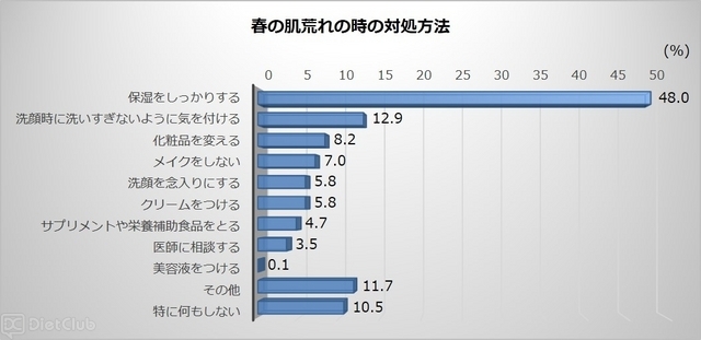 春に肌荒れを感じたことがある人にその対処方法を聞いたところ、春の肌荒れの症状で最も多かったのが乾燥だったこともあり、「保湿」と回答した人が最も多く48%となっているが、半数には満たない結果となった。続いて多いのが「洗いすぎないように気を付ける」となったが、まだ12.9%と少なく、逆に「念入りに洗う」(5.8%)という人も見られた。