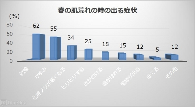 春に肌荒れを感じたことがある人に、どのような症状が出るか聞いたところ、最も多かったのは「乾燥」で62%、次いで「かゆみ」が55%。「化粧ノリが悪くなる」という人も3割以上となった。