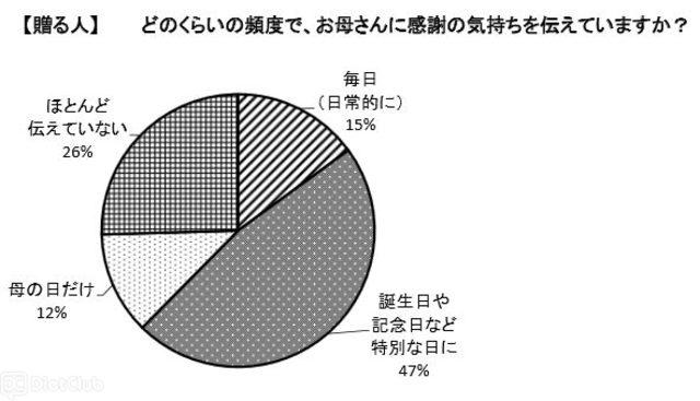 このほか、『どのくらいの頻度で、お母さんに感謝の気持ちを伝えていますか?』という質問では、47%の人が「誕生日や記念日など特別な日に」と回答したが、「ほとんど伝えていない」という人が26%いた。