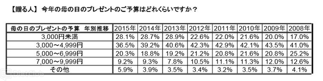続いて、『母の日のプレゼントの予算』を尋ねたら、1位は「3,000~4,999円(36.5%)」、2位は「3,000円未満(28.1%)」、3位は「5,000~6,999円(20.3%)」という結果に。