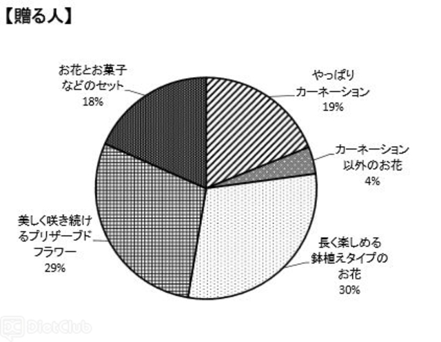 また、同調査で『母の日にお母さんに贈りたいお花はどれですか?』と質問したら、30%の人が「長く楽しめる鉢植えタイプのお花」と回答してトップに。その次に多かったのは「美しく咲き続けるブリザーブドフラワー(29%)」で、「やっぱりカーネーション」と答えた人は19%だった。