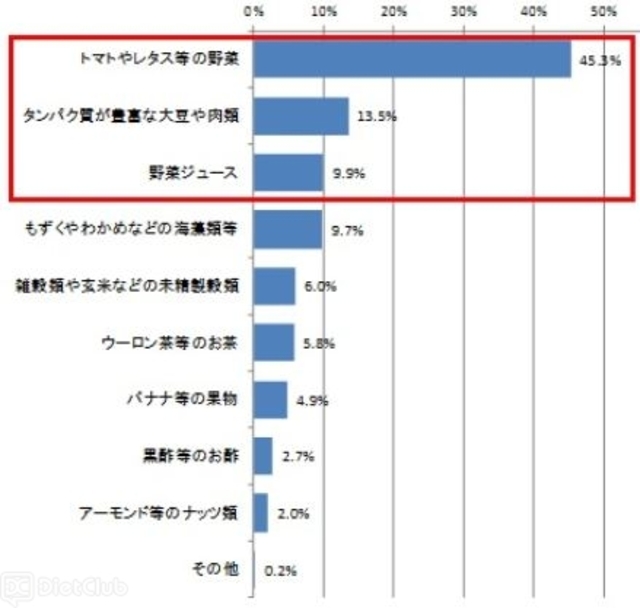このほか、食事で肥満・健康対策をしたい、またはしていると答えた人(554名)に、『食事で対策する場合、最も摂りたい食品』を尋ねたら、45.3%の人が「トマトやレタスなどの野菜」と回答してトップに。その他としては、「タンパク質が豊富な大豆や肉類(13.5%)」「野菜ジュース(9.9%)」「もずくやわかめなどの海藻類など(9.7%)」「雑穀類や玄米などの未精製穀類(6.0%)」という回答もあった。