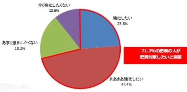 そこで、『新医療保険制度、特に予防・健康づくりにおける保険料減額、健康器具の交付といったインセンティブ付与を受けて、肥満対策を強化したいですか?』という質問をしたら、「強化したい(23.8%)」「まあまあ強化したい(47.4%)」と答えた人の合計が71.2%だった。