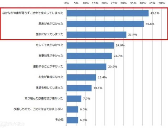 続いて、肥満改善に取り組んだことがあるという人(350名)に、『肥満改善に取り組んで、改善しなかった理由』を聞いたところ、1位は「なかなか体重が落ちず、途中で挫折してしまった」、2位は「意志が続かなかった」、3位は「面倒になってしまった」という結果になった。