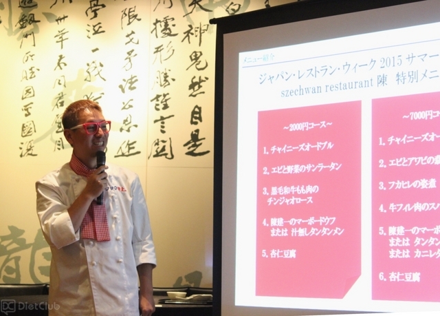 今回の試食会は、四川料理の巨匠・陳建一氏がオーナーを務める、東京・渋谷区のチャイニーズレストラン「szechwan restaurant 陳」で行われ、料理芸人のクック井上(お笑いコンビ・ツインクル)が司会として登場。グルメフェスのスタッフによる概要説明や、特別メニューを考案したシェフが料理の内容を紹介したあと、参加者たちに7,000円のディナーコース料理が振る舞われた。