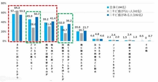 そこで、受診経験者(194名)に対し、受診理由やきっかけを聞いたら、57.2%の人が「きれいに治したかったから」と回答してトップに。それ以降は「どんどん悪くなっていったから(45.9%)」「病院で治療を受けるのが最も良いと思ったから(39.2%)」という結果になった。