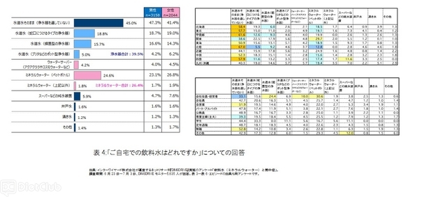 「自宅で飲んでいる飲料水は何か?」と聞いたところ、45.0%の人が「水道水をそのまま飲んでいる」と回答した。次いで多かったのは、蛇口に付けるタイプ・据置タイプ・濾過タイプなど、浄水器を使用して水道水を飲んでいる人が39.5%で、市販のミネラルウォーターを飲んでいる人が26.4%だった。