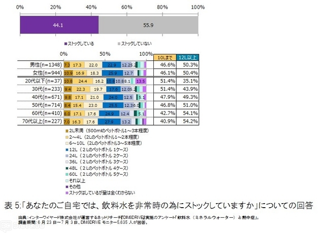 天災時の水不足に備えて「飲料水をストックしているか?」と聞いたところ、「ストックしている」と答えた人は44.1%と半数弱だった。12l以上を備蓄している世帯は50代以上世帯で約半数となり、若い世帯は半数を切っていた。