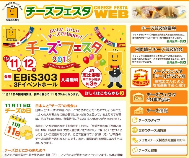 イベント会場は、エビススバルビル「EBiS 303」。開催時間は、11日が11時30分~20時、12日は11時~19時までで、入場料は無料。詳しいイベントスケジュールは、「チーズフェスタ2015」の公式サイトでチェックできる。