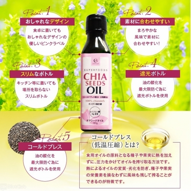 同商品は、スーパーフードとして注目を集めている「チアシード」を、低温圧搾(コールドプレス)して搾ったバージンオイル。
