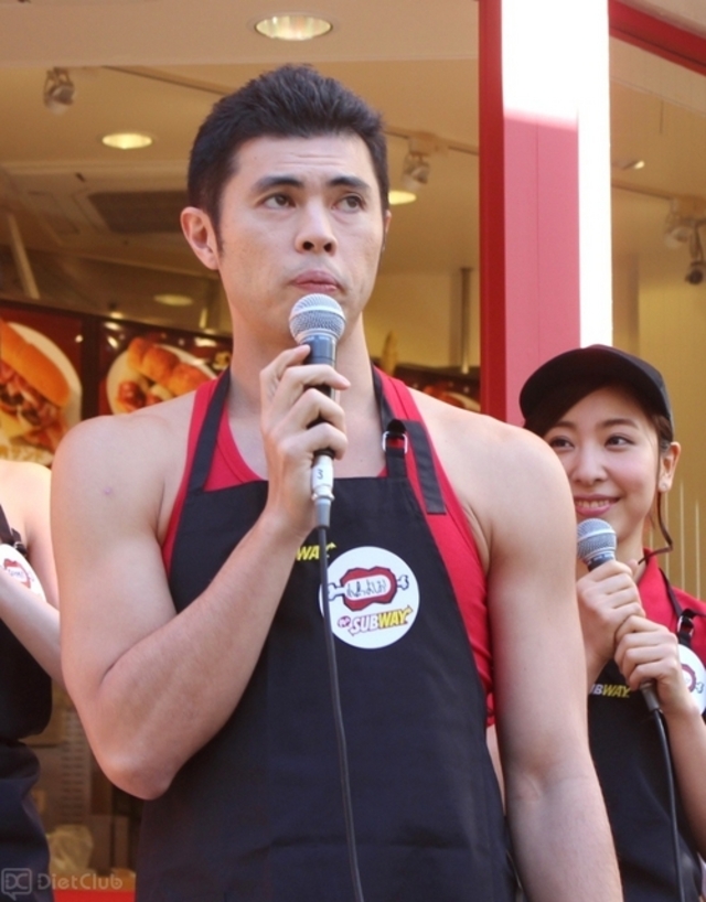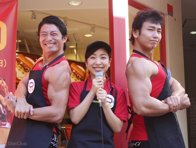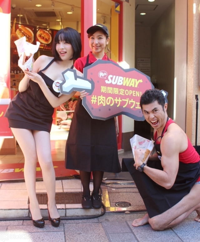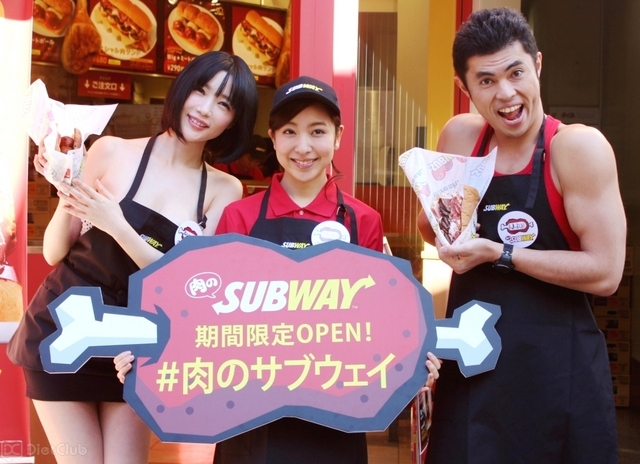 オープン初日の27日は、記者発表会が行われ、元AKB48・板野友美の妹で女優の板野成美が“肉のSUBWAY一日店長”として登場。さらに、お笑いタレントの小島よしお、グラビアアイドルの森下悠里の二人が“肉体派店員”として出演した。