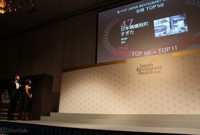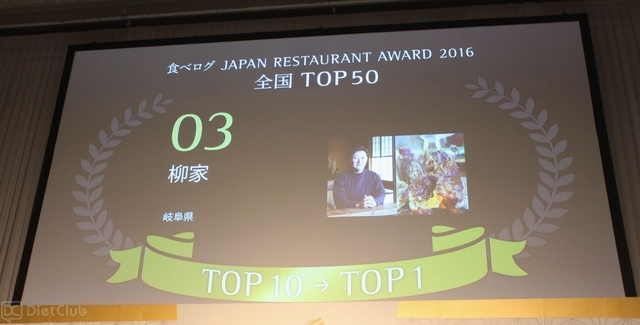 授賞式では、同社が運営するグルメサイト「食べログ」のユーザー投票から決定した“今、日本で最も美味しいレストラン50店”が発表され、1位は「松川(日本料理/東京都)」、2位は「鮨 さいとう(寿司/東京都)」、3位は「柳家(郷土料理・その他/岐阜県)」だった。